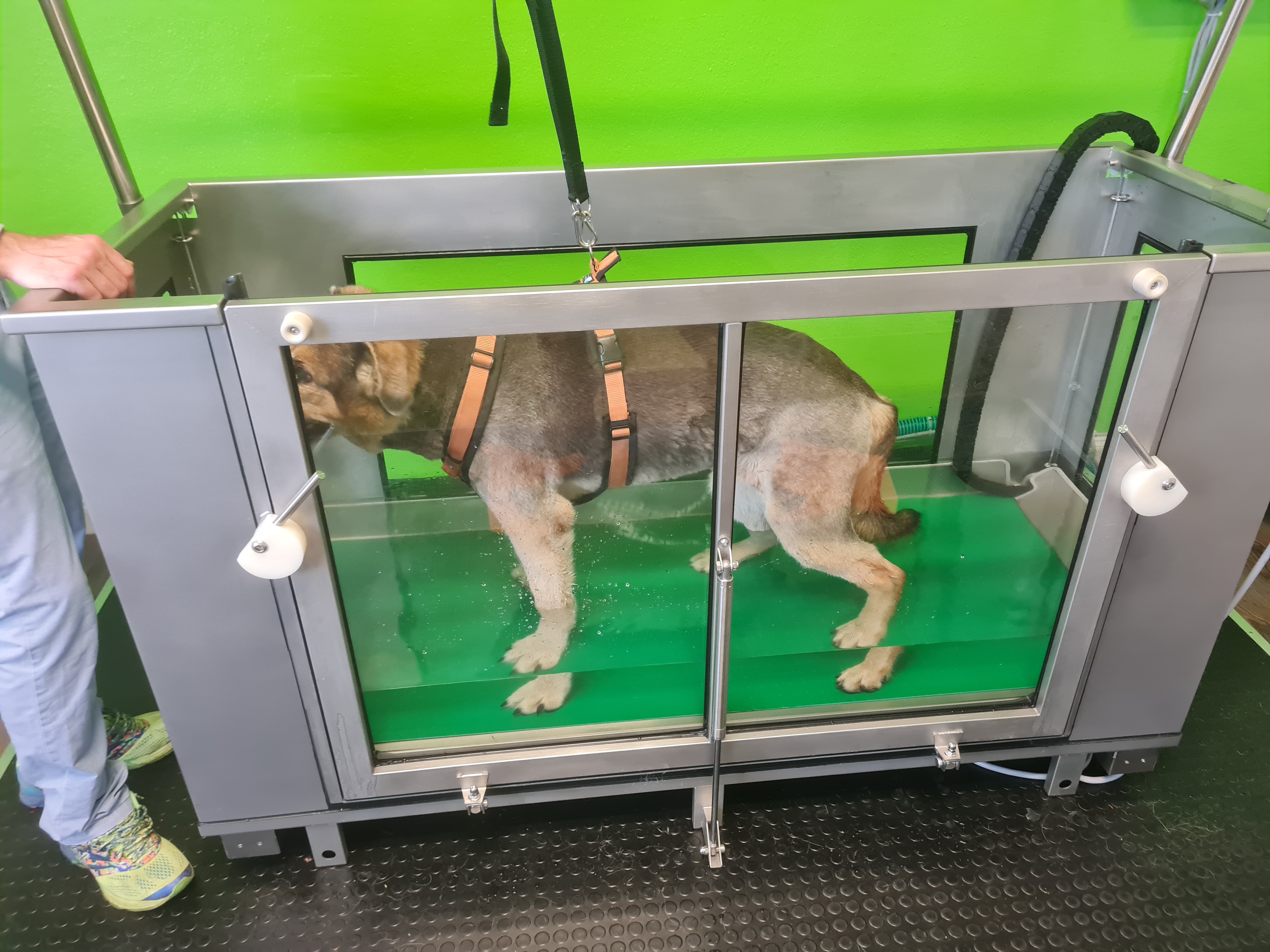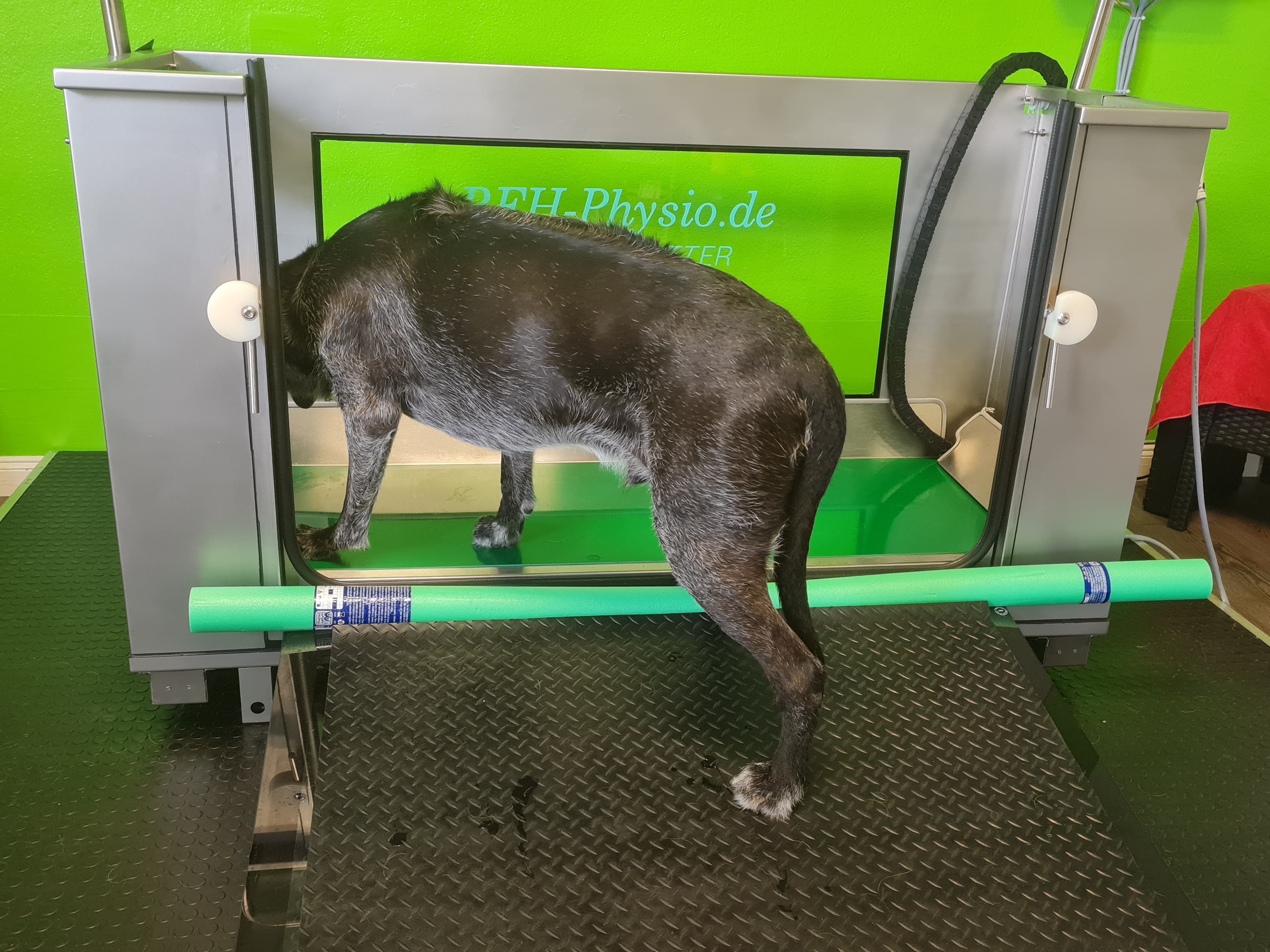 Die Hydrotherapie auf dem Unterwasserlaufband dient dazu, die körperliche Leistungsfähigkeit (z.B. Muskelkraft, Ausdauer und Beweglichkeit) des Tieres zu verbessern. Da das Wasser beim Laufen einen Widerstand bildet, wird beim Training auf dem Unterwasserlaufband der gesamte Körper Ihres Hundes beansprucht. Auf diese Weise wird die Muskulatur stark gefordert, während die Gelenke dabei geschont werden.